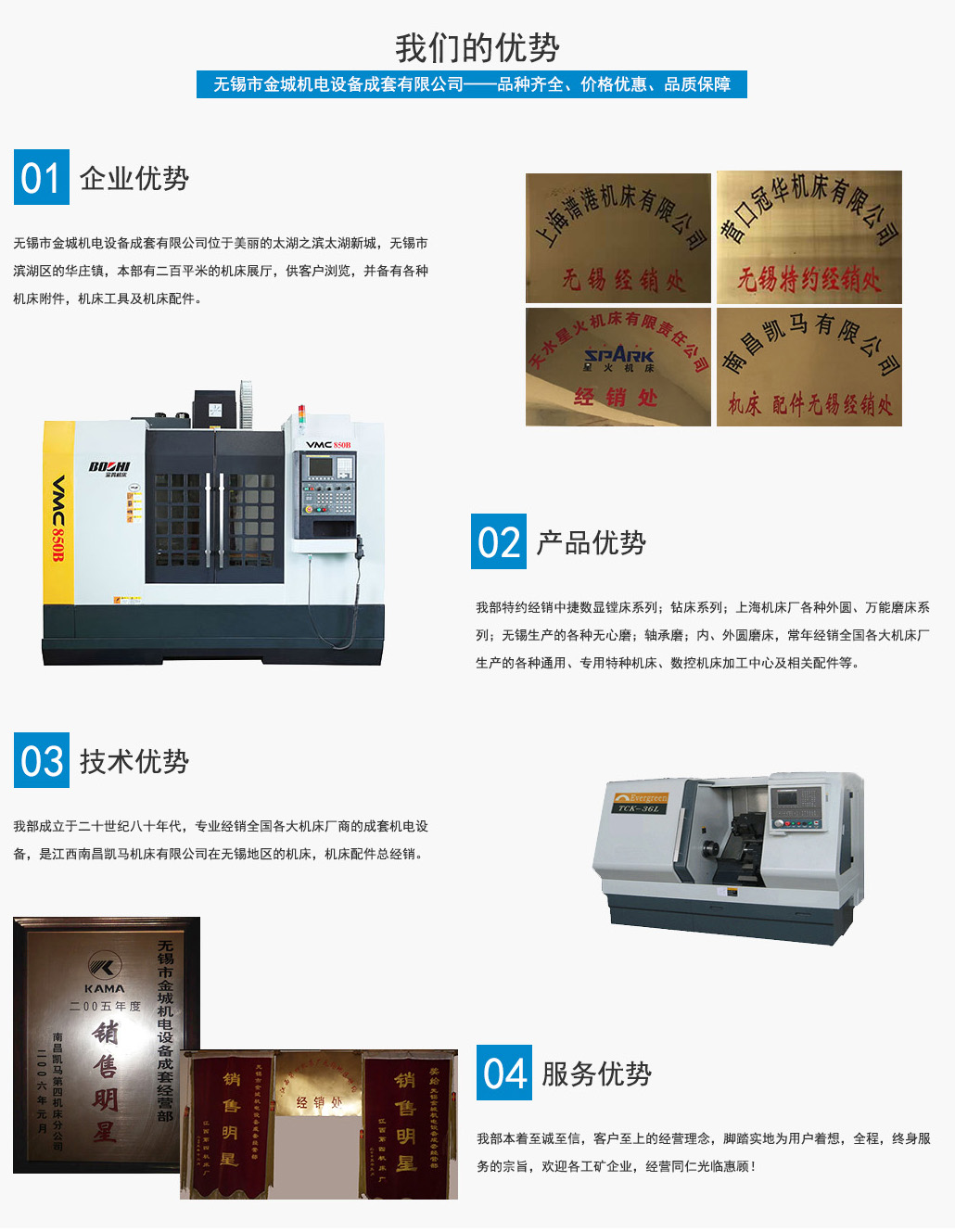 無錫市金城機電設(shè)備成套有限公司位于美麗的太湖之濱太湖新城,無錫市濱湖區(qū)的華莊鎮(zhèn),本部有二百平米的機床展廳,供客戶瀏覽,并備有各種機床附件,機床工具及機床配件。 我部成立于二十世紀(jì)八十年代,專業(yè)經(jīng)銷全國各大機床廠商的成套機電設(shè)備,是江西南昌凱馬機床有限公司在無錫地區(qū)的機床,機床配件總經(jīng)銷。系蘭州里海機床有限公司,天水星火...